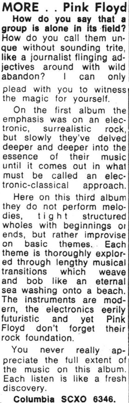 While being the third Pink Floyd album released in the UK, More was the first Pink Floyd album released in Australia. The catalyst for its release is unknown, although it's likely that being a soundtrack, EMI Australia assumed a parallel (or as near parallel as possible in Australia!) theatrical release.